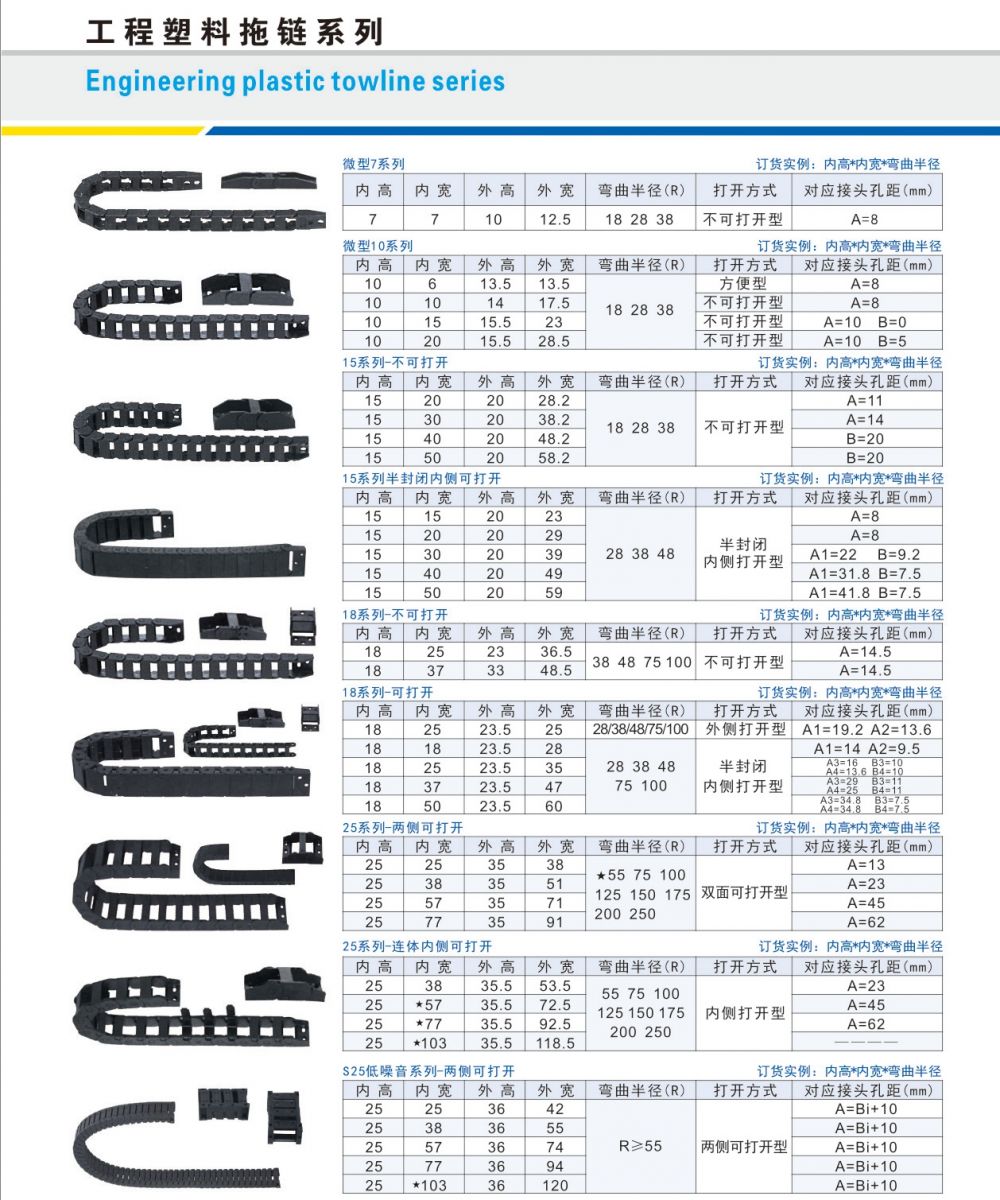 我公司大量生產(chǎn)供應(yīng)長(zhǎng)距離電纜拖鏈,該產(chǎn)品備三種結(jié)構(gòu)型式:(1)全封閉式(2)半封閉式(3)橋式。該產(chǎn)品由一節(jié)節(jié)鏈板組成,彎曲半徑大小互換,用戶可自行調(diào)整長(zhǎng)度,裝卸簡(jiǎn)單。耐磨、耐沖擊、強(qiáng)度高、重量輕、適合快速移動(dòng)。結(jié)構(gòu)堅(jiān)固,不會(huì)變形!我公司現(xiàn)有模具規(guī)格齊全,能夠滿足國(guó)內(nèi)機(jī)械行業(yè)的要求!歡迎廣大用戶來(lái)電洽談,定貨!電話:0317-6287811