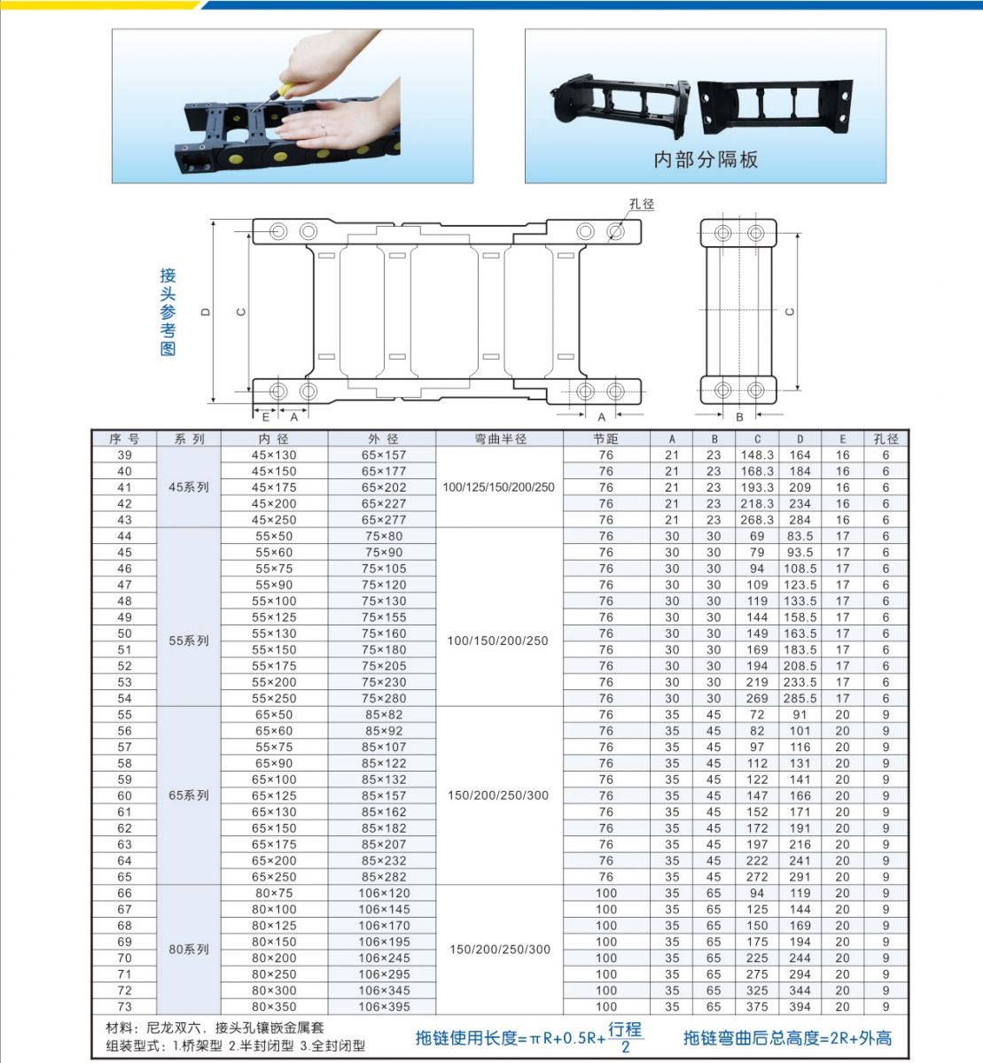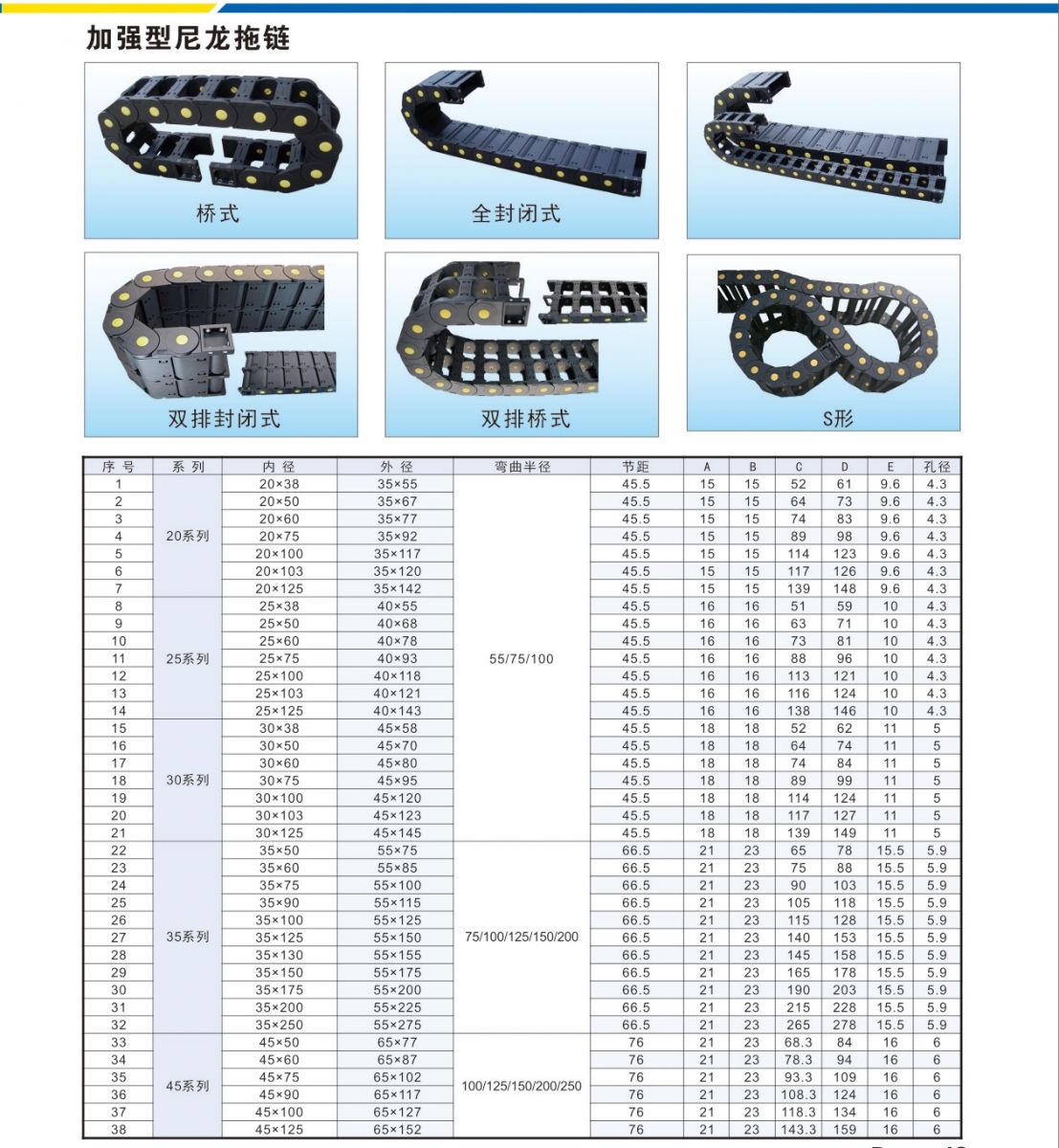 我公司大量生產(chǎn)供應(yīng)塑料電纜拖鏈,該產(chǎn)品備三種結(jié)構(gòu)型式:(1)全封閉式(2)半封閉式(3)橋式。該產(chǎn)品由一節(jié)節(jié)鏈板組成,彎曲半徑大小互換,用戶可自行調(diào)整長度,裝卸簡單。耐磨、耐沖擊、強度高、重量輕、適合快速移動。結(jié)構(gòu)堅固,不會變形!我公司現(xiàn)有模具規(guī)格齊全,能夠滿足國內(nèi)機械行業(yè)的要求!歡迎廣大用戶來電洽談,定貨!電話:0317-6287811